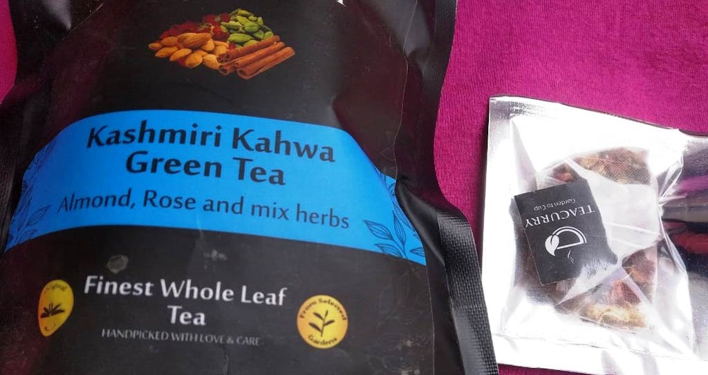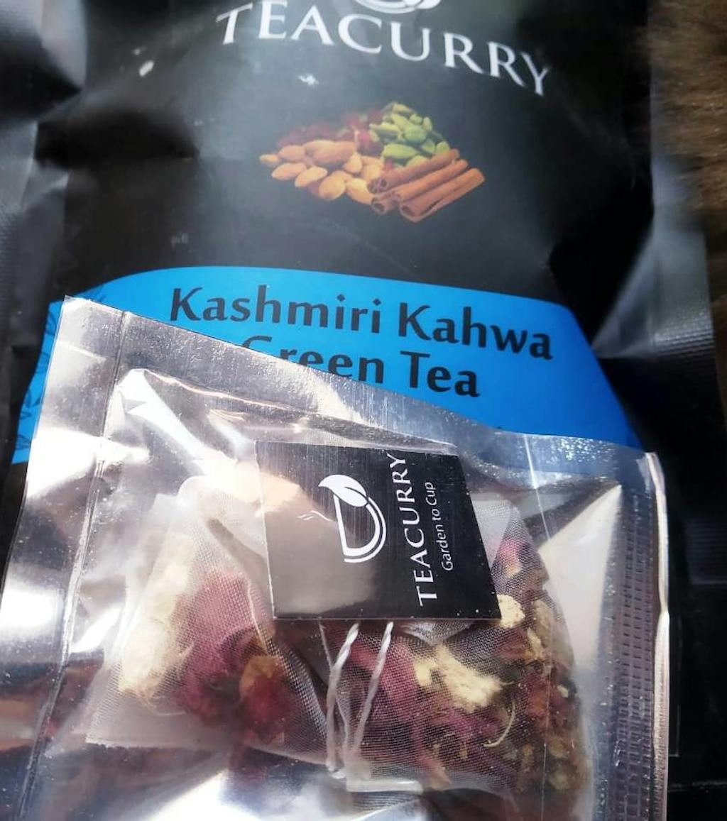 Teacurry Kashmiri Kahwa green tea is a perfect balance of taste, health & aroma - consisting of Penang Cloves from the farmlands of Tamil Nadu, Almonds sourced from Maharashtra, Mighty Ginger from the native farmlands in Orissa , Saffron, Rose petals from the gardens of Maharashtra, Cassia Cinnamon from Punjab, Black Pepper sourced from farmers in Kerala (South India), Green Cardamom sourced from the Idukki district in Kerala and green tea from the green tea fields in the valleys of Himalaya.