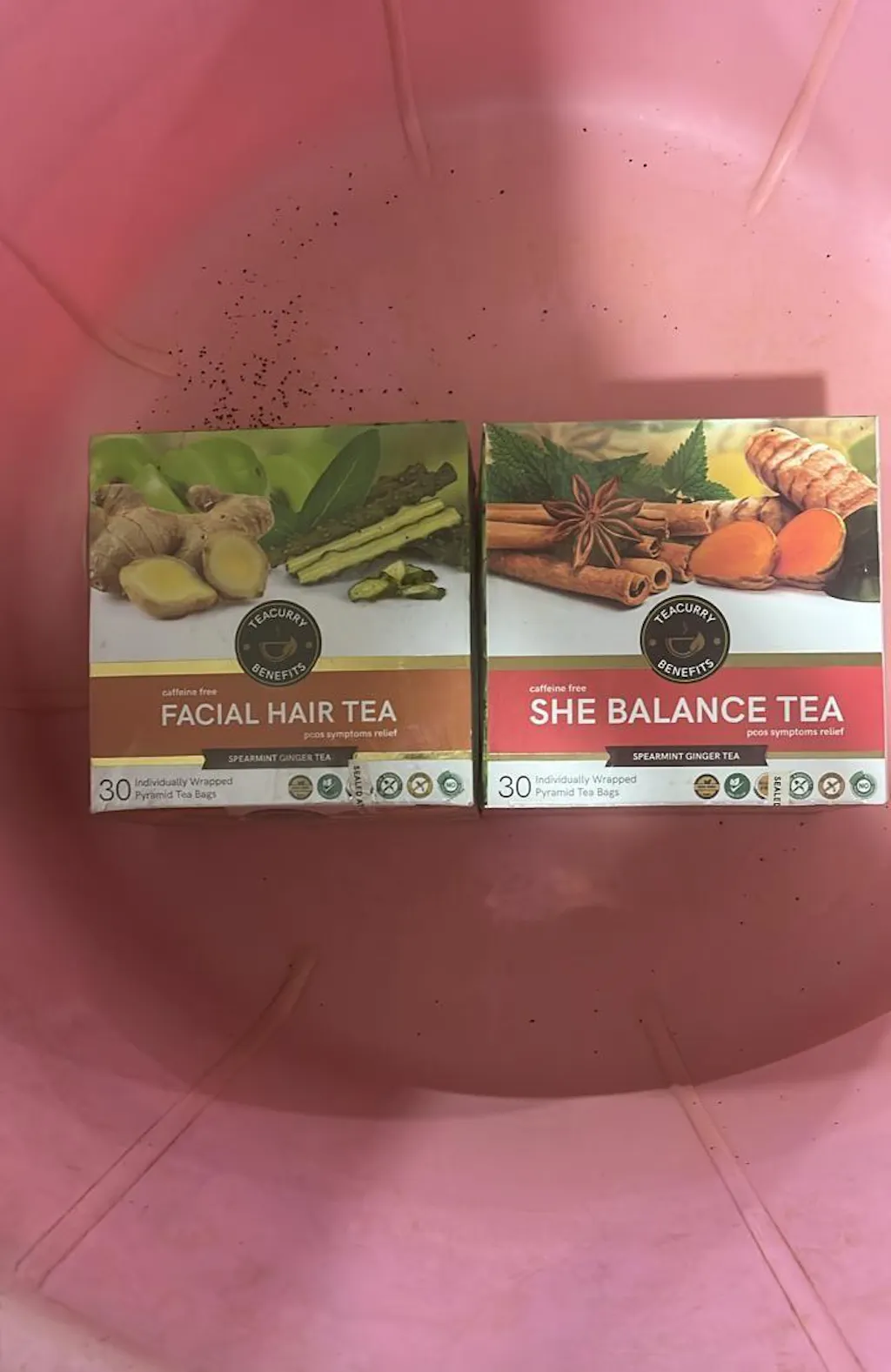 PCOS PCOD tea has an earthy aroma with sweet, warm notes of turmeric and fennel, while Facial hair removal tea has a minty, earthy aroma similar to turmeric and fennel steeped in water